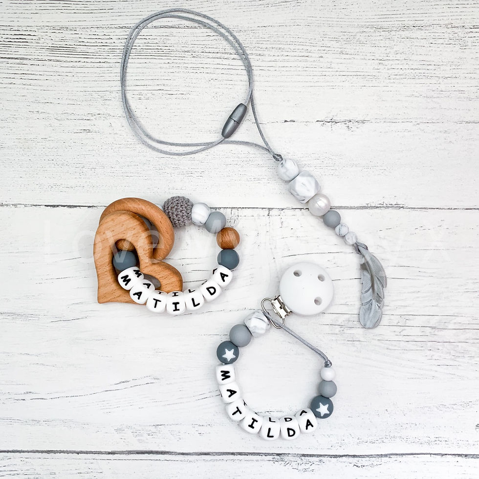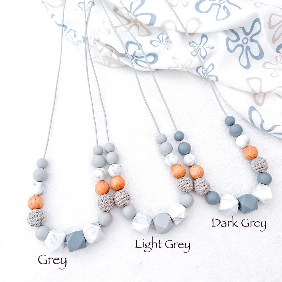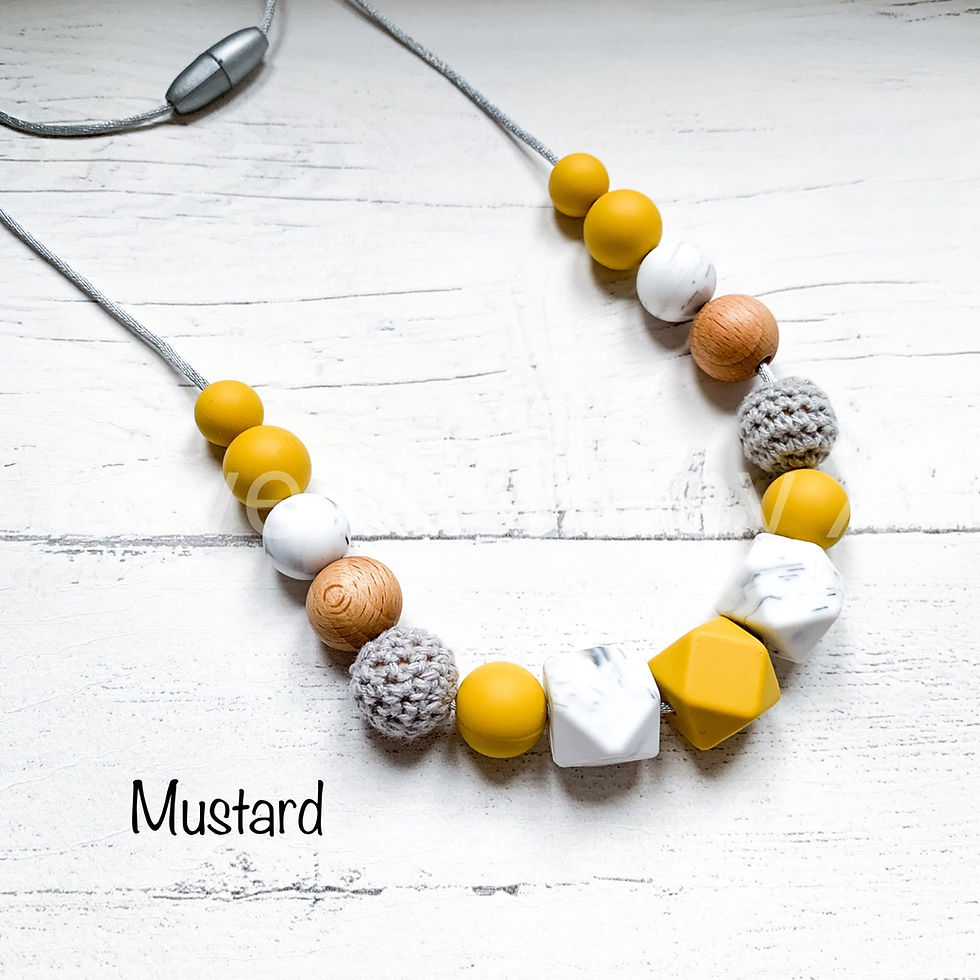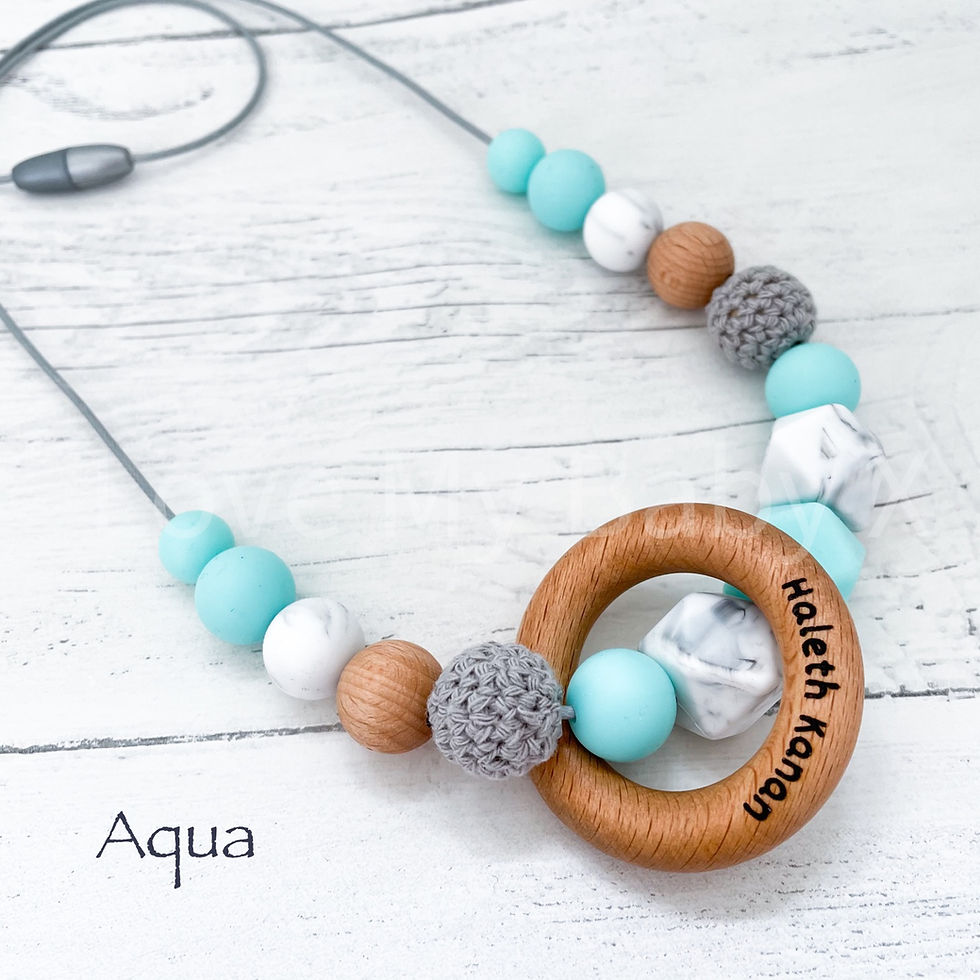 Some Teething necklaces can be Personalised . Nursing necklace with different shapes and textures
